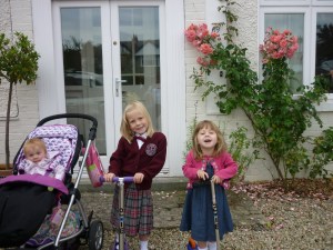 Yesterday the girls went back to school and playschool. Uniforms dusted down from the wardrobe; new white socks in squeaky new shoes; hairs cut and washed; schoolbags eventually found, emptied, cleaned and repacked; breakfast table set. As we left, I took a photo by the front door as I always do to mark the beginning of a fresh start. Last night I sent it to my mum, along with last year’s picture. What a difference a year makes.